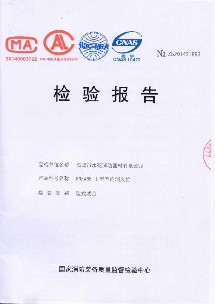 I plant was founded in June 1976, the existing staff of 600 people,including all kinds of technical and management staff of 68 people.With 50 millon yuan in fixed assets,covers an area of over 35,000 square meters,construction area of over 25,000 square meters.The establishment of a sound quality system. made a variety of "measurement of qualified certification",and become Jiangsu and more provinces of the fire association member units.Factory strong technical force,production and testing equipment,advanced technology.Production "water flower"brand water with intertace:KDK65,KD65,KY65,KN65.Fire water gun:QZG3.5/7.5,QZ3.5/7.5,QP8/0.7Z foam water gun.Indoor fire hydrant:SN65,SNW65-1,SNZ65,SNZW65-1.Fire hose reel JPS0.8-19/25.Production of "postal" card,fire with lining water:65-8,10,13.16,20,25 type;80-16,20,25 type.Water interface:KD50,65;KY50,65;KN65.Fire water gun:QZ3.5/7.5.5.Indoor fire hydrant:SN65,SNW65-1,SNZ65,SNZW65-I.And in May 2015 through the Ministry of Public Security Fire Product Conformity Assessment Center 3C version of the inspection access to all of the above products,mandatory certification,to allow the production and marketing,product marketing throughout the country,praised by the majority of users.